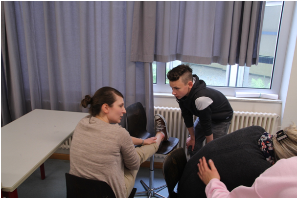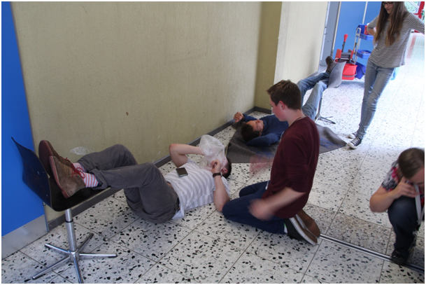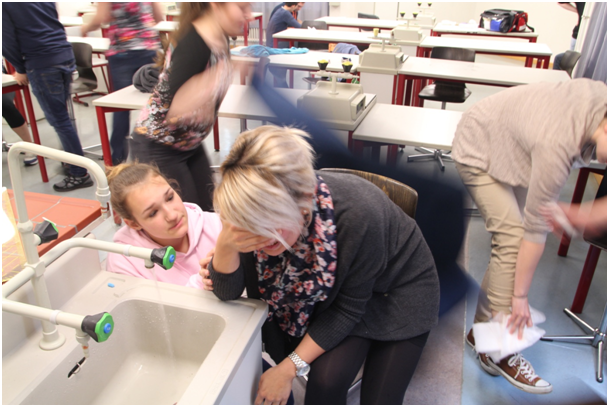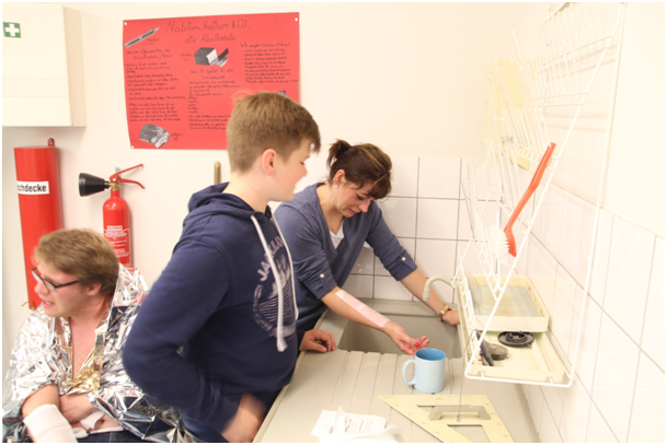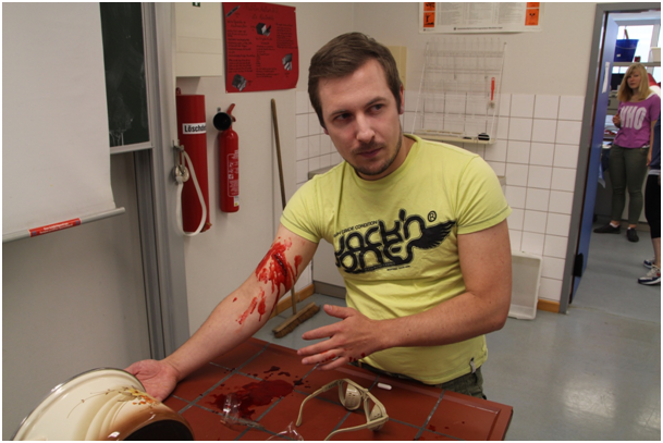 Einige Kollegen hatten sich freundlicher Weise bereit erklärt, sich von ehemaligen Schulsanis sowie befreundeten JRK-Mitgliedern, die uns unterstützten, schminken zu lassen und im Rahmen des Szenarios einer missglückten Chemiefortbildung eine entsprechende Verletzung darzustellen.