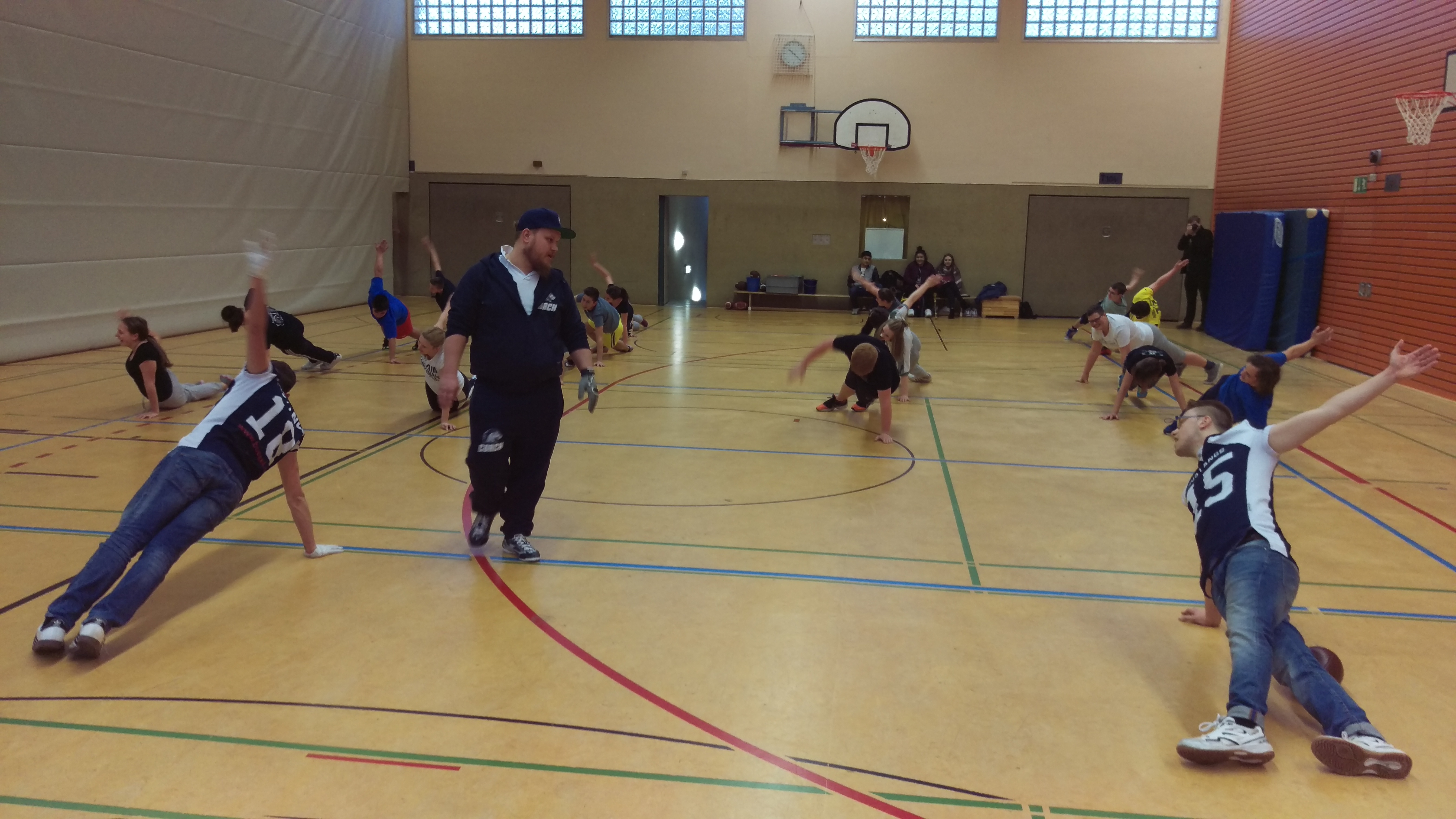 Als Bonbon lernten die Schülerinnen und Schüler das sichere Tackten eines Gegenspielers. Der Kontakt war durch den Sportlehrer Herr Dilks geknüpft worden. Schumann, im vergangenen Jahr noch Headcoach der Mannschaft, war selbst Schüler unserer Schule. Die Stunde machte den Schülerinnen und Schülern sichtlich Spaß. Wir wünschen den Mustangs in der Saison viel Erfolg.