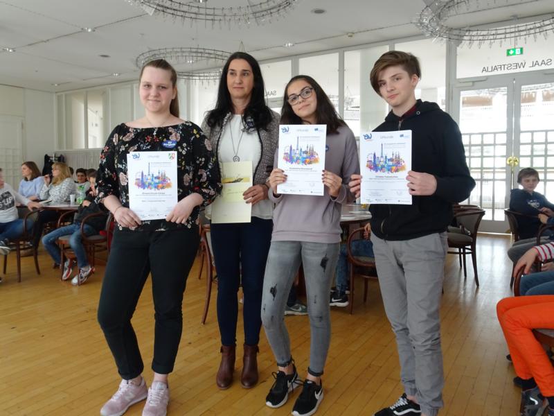 Beim 65. Europäischen Wettbewerb haben die Achtklässler Konstantina Giouvanoudi, Erosyni Karapa und Christos Triantafyllidis eine Arbeit zum Thema Baudenkmäler in Europa eingereicht. Gebaut wurde ein Modell der Akropolis in Athen, welches zusammen mit vielen Informationen und über die Akropolis und deren Bedeutung präsentiert wurde. Mit dieser Leistung gewannen die Schüler mit ihrer Lehrerin Vassiliki Karadoulami einen 3. Preis, der am 2. Mai von Petra Geers aus dem Schulministerium NRW im Rathaus Dortmund überreicht wurde. Es war zum ersten Mal, dass unsere Schule an diesem renommierten Wettbewerb teilnahm, alle 11 eingereichten Arbeiten unserer Schule wurden gewürdigt und erhielten eine Teilnahmeurkunde.