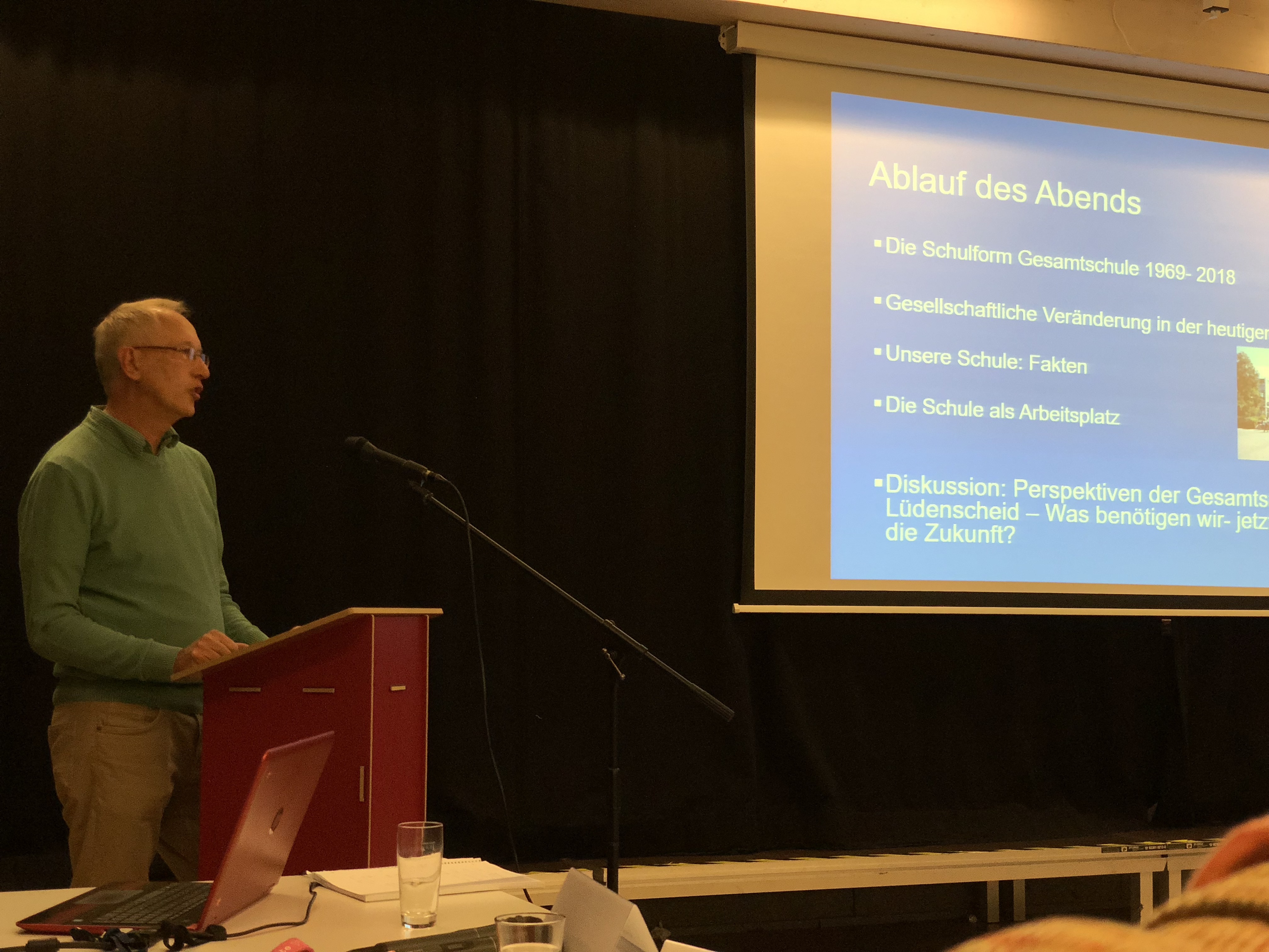 Lüdenscheid. 04.10.2018 in der mit 1246 Schülerinnen und Schülern größten Schule Lüdenscheids. Frank Bisterfeld, Schulleiter der Städt. Adolf-Reichwein-Gesamtschule Lüdenscheid, lädt zum 2. Gesamtschulforum ein. Frank Bisterfeld begibt sich zum Rednerpult, ein Mikrofon, ein Glas Wasser, im Raum das gedimmte Licht der Leuchtstoffröhren. Mehr als das braucht Frank Bisterfeld nicht, um von Beginn an mit entschlossener Stimme, das Publikum in der restlos gefüllten Mensa einzufangen.